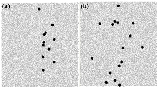 Simulation results of the distribution of soybean seed particles on the soil tray at relative seed throwing speeds of (a) 0.57 m/s and (b) 1.57 m/s.