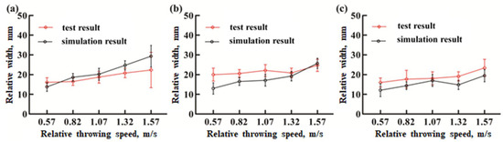 Figure 21 shows the relationship between the relative width and the relative seed throwing speed. The test results in Figure 21 show that, for SN42 and ZD39, the relative width of the soybean seed sowing strip gradually increased as the relative seed throwing speed increased, meaning that the rolling distance of the soybean seed particles increased as the relative seed throwing speed increased. For JD17, at a relative seed throwing speed of 1.32 m/s, there was a fluctuation and the relative width decreased slightly, but, overall, it was still consistent with the trend that the relative width of the sowing strip of soybean seeds gradually became larger as the relative seed throwing speed increased. For the simulation results, the trend was the same, on the whole, for the three varieties as for the test results. The relative width of the sowing strip increased as the relative seed throwing speed increased. The analysis showed that within the scope of this paper, there was a general rule that the greater the relative seed throwing speed, the greater the rolling distance of the soybean seed particles. Therefore, to reduce the bouncing and rolling distance of the seeds, it is necessary to reduce the relative seed throwing speed appropriately.