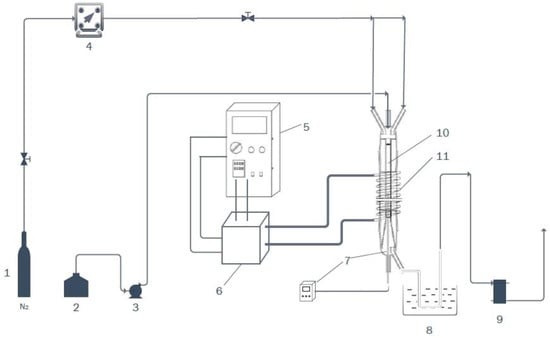 1—Nitrogen; 2—feedstock; 3—feeding pump; 4—moisture mete; 5—High frequency induction heating power; 6—cooling system; 7—K type thermocouple; 8—Ice bath; 9—Gas-solid separator; 10—reactor; 11—Induction coil