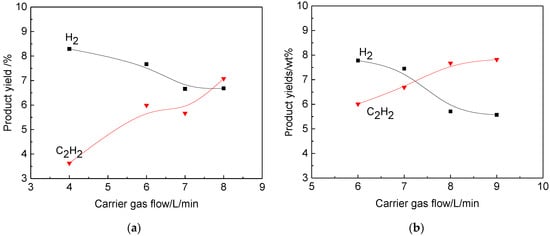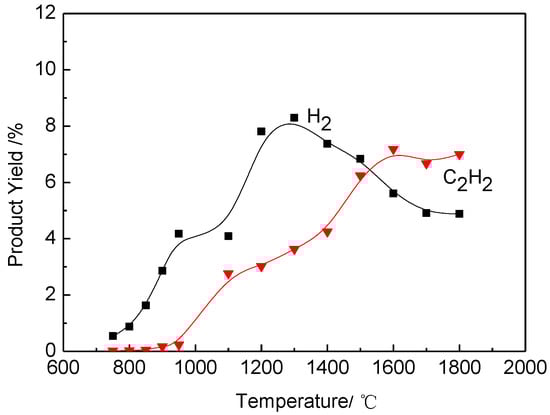 According to the literature [,,], when the temperature rises above 1500 K, the Gibbs function of acetylene becomes the lowest among the low-molecular-weight hydrocarbons. That is to say, when the reaction system is heated up to an extremely high temperature rapidly, acetylene is the most stable species among the hydrocarbons in the gas phase and will be the main gas component in principle. Therefore, the reaction temperature and residence time are the key factors in determining the yield of acetylene. Different from traditional reactors, a self-made electromagnetic induction heating device provides an extremely high temperature and short residue time which matches the requirements of acetylene generation. In the test, the investigation range of reaction temperatures is from 750 to 1800 °C, and the carrier gas flow of nitrogen is from 0.3 to 8 L/min to reach an optimum residence time. The different reaction temperature and nitrogen flow result in different residence times. When the temperature is from 750 to 950 °C and the nitrogen flow is 0.3 L/min, the residence time is about 600 ms. The reaction temperature is from 1100 to 1400 °C and the nitrogen flow is 4 L/min, the residence time is 50 ms. When we continue to increase the reaction temperature from 1500 to 1800 °C and nitrogen flow to 8 L/min, the residence time of 10 ms could be obtained. During the experiment, the residence time is defined as the time that the reaction material passes through the reactor. It is dependent on the reactor length divided by the average line speed.