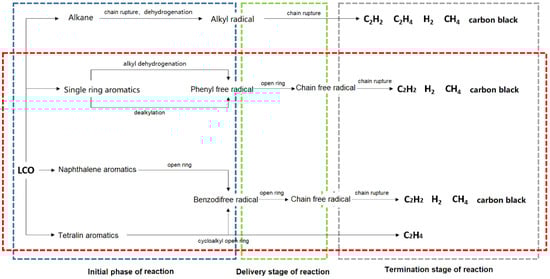Therefore, the high temperature cracking process of LCO can be summarized in Figure 5. It involves chain alkane, single cyclic aromatics, polycyclic aromatics, and tetrahydronaphthalene aromatics cracking. The chemical reactions of LCO high temperature cracking mainly involve the cracking of C-H, C-C, C=H, and C=C bonds. The intensities of these bonds influence the product distribution. The main products of this process are CH4, C2H4, C2H2, H2, and carbon black. The specific target product content could be obtained through optimized reaction conditions.