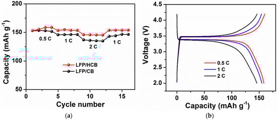 In recent years, carbon black is usually employed as the conductive additive for electrochemical energy-storage devices, such as lithium-ion batteries [,], super capacitor [], and lithium sulfur battery [], due to the extremely high conductivity, excellent chemical stability, and strong mechanical strength. The as-prepared high temperature carbon black (HCB) is employed as the conductive additive for LiFePO4 (LFP) cathode. For comparison, the commercial carbon black (CB) is used as the counterpart. Therefore, the corresponding electrode samples are labeled as LFP/HCB and LFP/CB. Their rate capabilities are shown in Figure 8a.