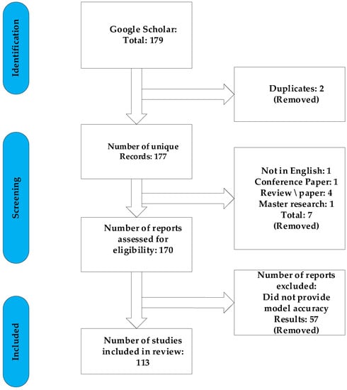 In this section, we outline our approach to review SA detection systems for the home environment. We conducted a comprehensive search across Google Scholar to find all research articles on the topic of automated SA detection in the home environment that were published between 2018 and 2022. We chose this period, because there was a lot of forward-thinking work on AI during that time. The database was queried using predefined Boolean search terms. Table 1 shows that the single search term “apnea home” returned 179 results. These articles were filtered according to the Preferred Reporting Items for Systematic Reviews and Meta-Analyses (PRISMA) technique [70]. Figure 1 shows the PRISMA flow diagram, which documents the article filtering and refinement process. During the filtering, we eliminated duplicate entries, review articles, conference papers, non-English publications, and manuscripts without ACC results. Overall, the filtering process eliminated 65 papers, and we were left with 113 original research publications.