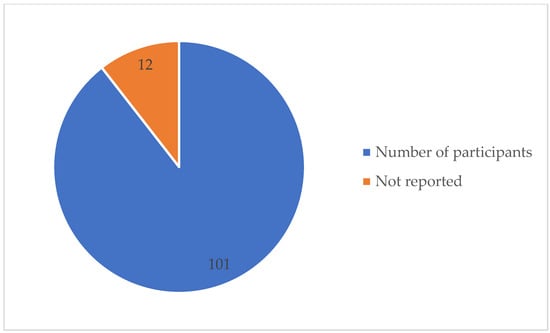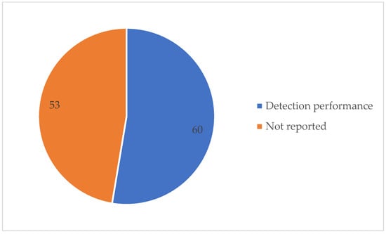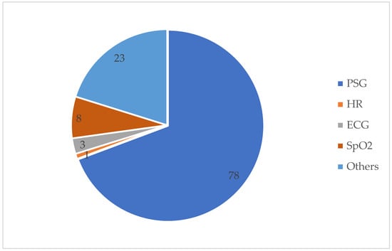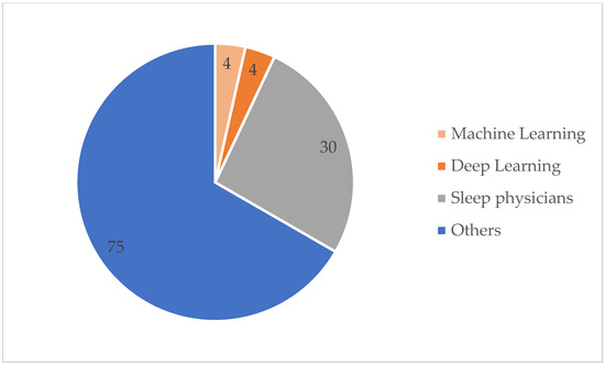 Table A1 details the detection method used and the SA detection performance for each of the 113 studies under review. The best detection performance, in terms of ACC score, was reached by a few of the investigations. However, these results were based on “apnea home” investigations, hence the findings may not reflect a widespread trend. We excluded duplicate items, review articles, non-English publications, Master’s dissertations, and works irrelevant to our criteria. Furthermore, during this investigation, we discovered other papers that were relevant to our criteria, although these articles only had an abstract. In this case, we had to remove these articles from our work. As seen in Table A1, several signals have been employed in a range of different studies. Each signal has different purposes. The signals that were used in this article are PSG, SpO2, home respiratory polygraphy (HRP), home polygraphy (HPG), ECG, seismocardiography (SCG), PPG, polygraphy (PG), respiratory inductance plethysmography (RIP), audio, and HR. Figure 2 shows the signals used by the 113 evaluated studies. Table A1 in Appendix A provides further details on these SA detection studies. Figure 3 shows the approaches used in this work to detect SA. The numbers in the pie charts represent the amount of research articles that reported each method. The pie chart in Figure 2 reveals that PSG signals are the most-studied method among the examined publications, with 78 total research articles using this method. There were eight studies using HR signals and three studies using ECG. SpO2 was only utilised in one study. Twenty-three research articles employed other signals, as shown in the pie chart in Figure 3. Machine learning and deep learning were utilised four times each, as seen in Figure 3. Sleep physicians were the most reported to detect SA in a total of 30 studies; 75 studies used other methods. Figure 4 depicts the data management approaches, which included 35 online studies, 30 offline research, and 48 unreported studies. Figure 5; Figure 6 show the number of participants and the accuracy distribution. It can be observed that 101 people participated in this study, with 12 not participating. Furthermore, Figure 6 depicts the specifics of 60 studies that reported their accuracy and 53 studies that did not report their accuracy.