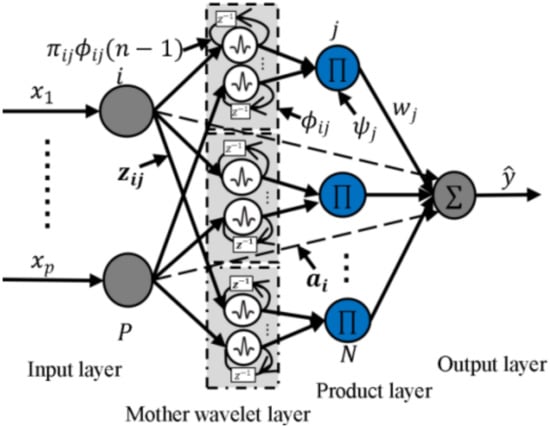 where is the wavelet expansion parameter; is the wavelet shifting parameter; represents regression weights; represents the (n − 1)th output of the mother wavelet layer; the wavelet basis function of the wavelet layer is chosen as .