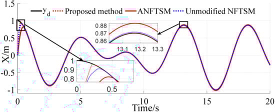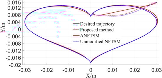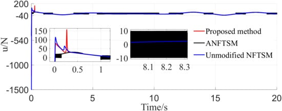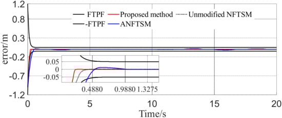 Overall, the NFTSM surface designed in this paper can maintain a fast descent speed throughout the descent process, which better balances the convergence characteristics near the equilibrium point and avoids the compensation input from being too large when the initial error is significant, and can ensure the tracking error evolves within a strictly finite time FTPF. In addition, the convergence speed of our method is acceptable, and the corresponding control force and convergence error are the smallest of all the compared methods. In addition, it does not suffer from violent chattering, contributing to the sustainability of the actuator.