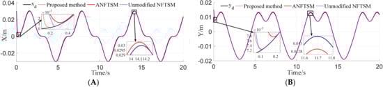 The system complexity of this example is low relative to Experiment 1, and the output of the amplitude by the controller is small. As can be seen from Figure 7, Figure 8, Figure 9, Figure 10, Figure 11 and Figure 12 and Table 4, both our method and the unmodified NFTSM have good control effects, while the ANFTSM produces larger jitter during convergence. As shown in Figure 7 and Figure 8, the proposed NFTSM control and unmodified NFTSM control have tracked the reference signals with extremely high precision. In terms of position tracking error, in the X-direction ANFTSM tracking error is the largest, and the maximum tracking error is around 8 cm after 0.8 s. Unimproved NFTSM has a noticeable local maximum error around 0.3 s, which is about 1 mm, and the proposed method is below 0.5 mm; for the y-direction, ANFTSM tracking error is obviously larger, and the tracking errors of the other two algorithms are less than 0.001 mm after 0.15 s; for the driving force of each axis shown in Figure 9, ANFTSM shows continuous fluctuations throughout the operation phase, and the local driving force reaches more than 0.0015 rad, and the other two algorithms show a larger driving force at the initial moment, about 0.26 rad, but the duration is within 1 s, which is due to the larger position error in the initial moment which makes the perturbation estimation value larger, caused by the other moments of the drive being smoother, but through the local magnification chart it can be seen that the algorithm in this paper appears as a small local drive fluctuation, which is due to the small perturbation estimation error and the fluctuation of the perturbation estimation error makes the adaptive term coefficient change generated. Because most of the perturbation is estimated by SRWNN, the perturbation estimation error is more minor and the fluctuation of the driving force is smaller. Compared with Table 4, it can be seen that the shortest regulation time of this paper’s algorithm is about 0.230 s and the maximum of ANFTSM is about 0.385 s, compared with other algorithms. In addition, TAE, ITAE, and CE are consistent with the results of the regulation time.