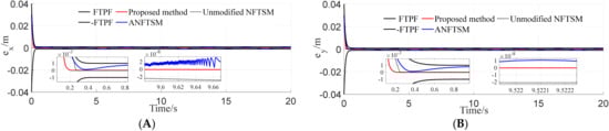 Unlike the NFTSM surface in [31], ours is Lipshitz continuous holistically. There is no need to switch the NFTSM to a linear sliding mode surface to eliminate the singularities of the TSM controller when the generalized position state is close to equilibrium. Furthermore, when we build the non-singular terminal sliding mode surface (NFTSM), the controlled states converge quickly to the small neighborhood containing the equilibrium, which means that most of the dynamics of the classical terminal sliding mode (TSM) is preserved. As the system state moves away from the equilibrium point on the NFTSM surface (18),plays a dominant role in ensuring a faster convergence rate. As the system state approaches the equilibrium point,allows the system tracking error to converge rapidly to zero. Thus, our proposed NFTSM surface provides for rapid convergence of the global error variables to zero.