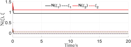 This allows us to easily apply Example 1 to the controller designed in Section 3. From the literature [23,24,25] and the comparison method (ANFTSM), it can be seen that the most significant advantage of the method in this paper is that the positive and negative singularity of Gn need not be known in advance. Only the stability index in Lemma 1 needs to be satisfied, which is achieved by introducing the Nussbaum function to simplify the design of the controller. Another advantage is that we introduce a relative threshold event triggering mechanism, which can save a large amount of communication resources compared to time triggering.
