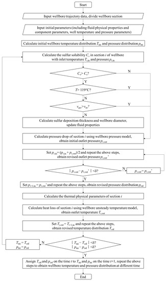 It is shown that some parameters interacted with each other in the wellbore pressure model and unsteady temperature model. Considering the influence of sulfur precipitation and deposition, the fluid physical properties and wellbore inner diameter will also change with time. In this paper, the sulfur deposition prediction model is coupled with the wellbore pressure and temperature model through numerical approximation, and the numerical simulation of sulfur deposition in the sour-gas well is carried out. The coupling solution steps are as follows: