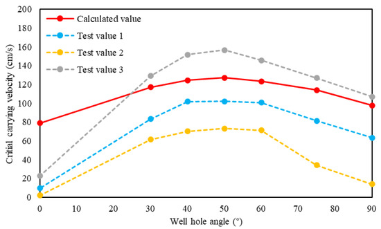 According to the experimental results of Ford [29], the critical suspension velocity is roughly the same as the critical roll velocity when the inclination angle is 40~60°. Considering the continuity of the relationship between the solid-sulfur-carrying velocity and the inclination angle, the paper deems that when the wellbore inclination angle is less than 45°, the solid sulfur particles mainly move to the wellhead by suspension, and when the inclination angle is greater than 45°, the solid sulfur particles mainly move to the wellhead by rolling. Therefore, the calculation formula of critical solid-sulfur-carrying velocity is: