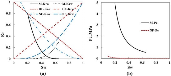 In this grid model, the generated fracture network is divided into the hydraulic fracture (HF) and natural fracture (NF). After that, the relative permeability and capillary pressure curves for matrix (M) and fracture systems are adopted from Chen and Jurus [,], respectively, as shown in Figure 1. Due to the high permeability, the capillary pressure for hydraulic fracture is ignored. And the PVT parameters of fluids are according to Liao []. Then, with the well schedule as shown in Table 3, the fluid flow behavior in the stimulated reservoir can be described. Here the gel breaking process of fracturing fluid is assumed to be completed immediately after pumping, so the viscosities of slick and gel water are both equal to 1 mPa·s.