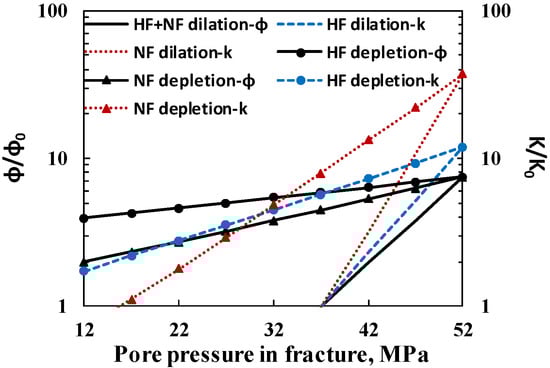 where Φf is current fracture porosity; Φf0 is initial fracture porosity; Pnet is net pressure in fracture, MPa; kf is current fracture permeability, mD; kf0 is initial fracture permeability, mD; and m is permeability changing factor, MPa−1. The values of Cf and m can be obtained experimentally, or by data-fit if the experimental conditions are not available. In this paper, the Cf values of HF and NF obtained by the history-match of the pumping process are both 0.134, and the m values are 0.165 and 0.247, respectively. Also, for the flowback process, the matched Cf values are 0.016 and 0.033, and the m values are 0.048 and 0.099, respectively. The results of the pressure sensitivity model for complex fracture are presented in Figure 2.