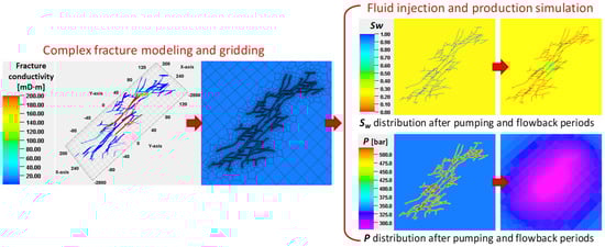 To study the fluid flow behavior, the primary task is to illustrate the distribution of reservoir pressure and saturation fields at the end of the pumping period. Therefore, oil-water production modelling needs to start with the injection of fluid. Recently, the pressure-dependent permeability of the matrix has been adopted to improve injection ability, but this method lacks rationality and overestimates the increase of shale matrix permeability []. Besides, it is hard to describe the key drive mechanism of fracture closure at the early period of flowback.
