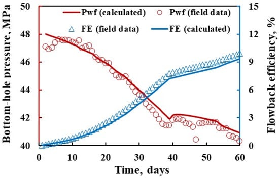 Due to the frequent change of choke in the early flowback stage, daily output fluctuates dramatically, which is the main challenge for quantitative validation of simulation results [,]. In this section, the field treatment scale (Table 3) was used to generate the complex hydraulic fracture (Figure 3). The calculated results were consistent with the micro-seismic interpretation as shown in Table 4, which verified the suitability of the proposed model to characterize complex fractures. After that, a trial-and-error method was carried out to realize the fitting between the actual and the calculated flowback performance. As the initial pressure fluctuation could easily terminate the simulation, daily liquid production data was adopted to match properly. As shown in Figure 4, the fitted results were quite acceptable, which proved the applicability and reliability of the presented workflow. Although acceptable quantitative fitting was completed, it was difficult to achieve an ideal match at the early and late stages of flowback. Since the choke size is frequently switched at the early period, higher frequency data is required to capture the production performance, which is hard for daily output. Moreover, wellhead pressure data are generally recorded rather than reliable bottom-hole pressure, which increases uncertainty for quantitative fitting.