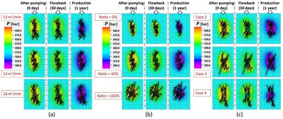 Pumping rate is an important parameter to determine the effect of shale stimulation. Two cases of 12 and 16 m3/min were simulated and compared with the basic model (14 m3/min). The production lasts for 1 year, and the results of fracture configuration, pressure distribution, flowback efficiency and oil production are shown in Figure 5a and Figure 6a.