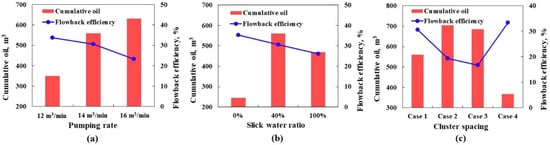 Cumulative oil and flowback efficiency: (a) pumping rate. (b) slick water ratio. (c) cluster spacing.