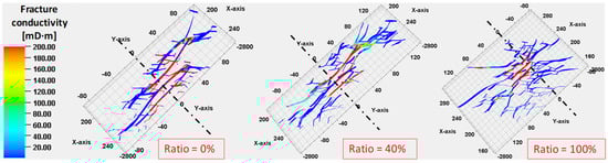 Figure 6b reports that, when the ratio is 0%, 40% and 100%, the flowback efficiency is 35.3%, 30.5% and 26.1%, respectively, indicating that the water recovery decreases with the ratio of slick water. This is due to: (1) According to Figure 5b, the fracture complexity increases significantly with the ratio of slick water, which greatly enlarges the contact area between fracture and matrix. Thus, the amount of water imbibed and retained in the matrix increases. (2) The weak sand-carrying performance of slick water greatly reduces the fracture conductivity (FCD) located in the oil layer. Figure 7 shows the FCD distribution of the whole fracture system under the different ratio of slick water. Compared with the other two cases, the high permeable area near the wellbore shrinks significantly when 100% slick water is used.