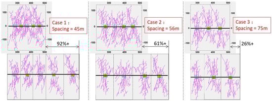 Figure 9a shows that: (1) the load-recovery efficiencies of the three cases are 25.8%, 28.6% and 32.2%, respectively, which increase with the stage spacing. (2) Conversely, the oil production increases with the spacing narrowing, but the growth slows down. Furthermore, the average cumulative oil production of each individual stage is 447.7 m3, 509.8 m3 and 519 m3 for the three cases, indicating that the production contribution of a single stage is positively correlated with its spacing. This is because, although the fracture complexity increases obviously with the reduction of stage spacing, the stimulation and drainage area of the individual stage is narrowed down accordingly.
