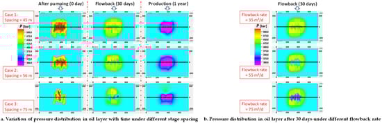 Variation of pressure distribution in oil layer: (a). stage spacing. (b). flowback rate.