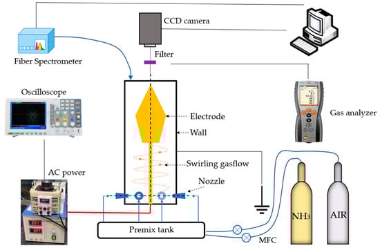 With the rapid development of the world economy, the problem of CO2 emissions caused by the use of large amounts of fossil fuels has become increasingly prominent []. Excessive CO2 emissions have brought a series of environmental problems such as the greenhouse effect. In order to solve these problems effectively, many scientists have proposed a variety of technologies to curb CO2 emissions. In recent years, ammonia has attracted the attention of many scholars as a zero-carbon fuel [,,]. Ammonia has the characteristics of easy production, storage and transportation. It can store and transport energy that is difficult to use effectively such as wind and solar at a low cost, and release energy through burning, thus it is a very promising zero-carbon fuel [,]. However, ammonia as a fuel has the disadvantages of long ignition delay time, low flame propagation speed, small flammable range, and easy generation of a large amount of nitrogen oxides during combustion, which limits the large-scale utilization of ammonia as a fuel [,,]. In order to effectively solve these problems, scholars have proposed a variety of technologies. Among these, the use of low-temperature plasma to assist ammonia combustion is one of the more feasible solutions [,].