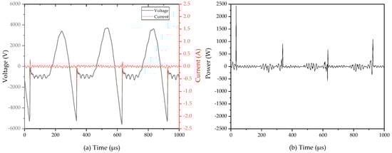 The 1000:1 capacitor voltage divider is used to step down the output signal of the high-voltage power supply, and then the oscilloscope (YOKOGAWA DL350, Tokyo, Japan) is used to collect its current and voltage signals, and the collected current and voltage signals are used to obtain information such as instantaneous power and average power. The calculation formulas of instantaneous power and average power are as follows: