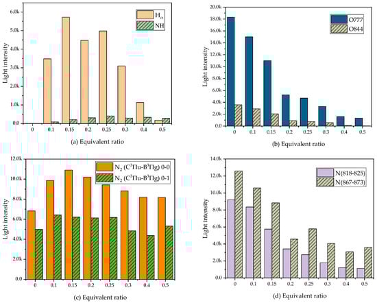 At the same time, in Figure 6, it can be seen that there is an obvious NH band near 336 nm, which overlaps with the tail of the N2 band. It can be considered that the theoretical value of the N2 band obtained by subtracting the total light intensity of the spectral band at the corresponding wavelength is the NH light intensity. It can be seen from the figure that the ratio of NH to N2 light intensity increases significantly with the increase of the equivalence ratio, indicating that the content of NH is gradually increasing.