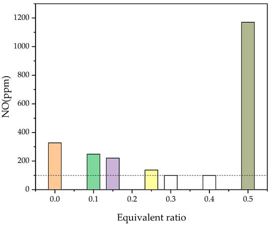 Figure 7 shows the variation trend of NO content at the outlet position with the equivalence ratio recorded by the flue gas analyzer. As can be seen from the figure, it may be that the plasma contains more excited N and excited O species, thus more NO is generated through the plasma chemical reaction. At the same time, due to the high arc temperature of the gliding arc device, thermal NO will be generated [], so a larger amount of NO will still be generated when discharging with pure air. However, with the addition of NH3, the NO content showed a significant downward trend when the equivalence ratio did not reach the flammable range. The main reason was that NH3 is excited to produce a series of excited species during the discharge process [], and these species rapidly dissociate to produce excited NH2 and H [], at the same time, the generated NH2 can further react to generate active radicals such as NH. NH2 and NH can reduce the NO generated by the discharge and arc thermal effect through the reaction of R4, R5, etc. [], thereby reducing the NO content at the outlet. When the equivalence ratio is 0.5, the NO content at the outlet increases sharply with the combustion of NH3.