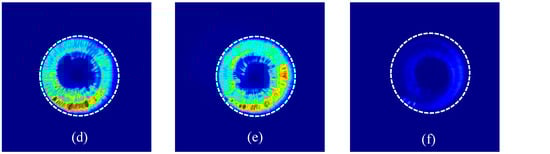 Axial imaging picture of swirl burner with filters, (a–c) 660 nm, (d–f) 780 nm, (a,d) pure air, (b,e) EQR = 0.1, (c,f) EQR = 0.5.