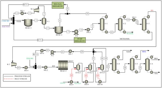 Aspen Energy Analyzer V11.0 (AEA) [31] was used to develop and optimize the HEN. Three cases were considered. The base case considers the overall plant that converts ethylene to EO and EO to EG with no heat integration. The second case considers a scenario in which the overall plant is divided into two sub-plants—(1) ethylene to EO and (2) EO to EG—and heat integration is achieved only within the two sub-plants, but no heat integration occurs between the two sub-plants. The third case considers a scenario where in which integration is performed for the entire flow sheet.