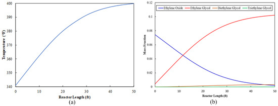 The EO stream is sent to the ethylene glycol production section as a feed stream. This stream mixes with water, and the mixture travels to the multitube reactor, where an exothermic reaction occurs. A variety of design parameters were tested for the multitube reactor configuration. The objective was to determine a set of parameters that results in the utilization of as much EO as possible. The final multitube configuration is shown in Table 6. The reactor tube length can be validated in two ways: first, the optimum length is the length beyond which there is a negligible increase in temperature. Because the glycol formation reaction is an exothermic reaction, a zero rate of change in temperature indicates that the reaction is complete, as shown in Figure 2a. The reactor tube length can also be validated by observing the progression of required product concentration along the tube length. If the product concentration is unchanged after a certain length, then the point at which the concentration stops increasing is the optimum length for the reactor tube, as shown in Figure 2b. Figure 2b shows that 97% of EO is utilized.