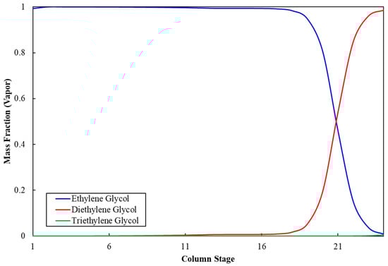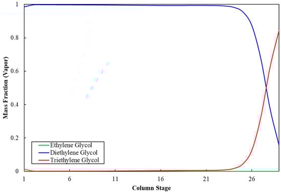 Figure 3 shows the ethylene glycol composition profile along the stages of column C-5. The mass fraction of MEG at the top of the column is 99.9%, whereas it is negligible at the bottom, which indicates appropriate separation of MEG from impurities and validates the operating and sizing parameters for column C-5. Similarly, Figure 4 shows that the mass fraction of DEG at the top of column C-6 is 99.9%, whereas it is negligible at the bottom, which validates the operation and sizing parameters for column C-6. Table 11 shows the stream results of the developed integrated process.