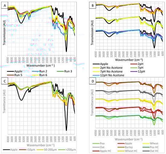 FTIR spectrum of (A) HC produced under different process temperatures, solution ratio and residence time, Run 5, Run 6, Run 2 and Run 3, respectively, (B) HC produced at different solution pH and washed with acetone, (C) HC produced using different particle size and (D) HC produced from different biomass feedstocks.