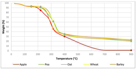 TGA was performed on the biomass feedstocks to identify the key components. Biomass usually has a composition of 15–30% hemicellulose, 40–60% cellulose and 10–25% lignin [14]. This changes depending on the function of the biomass. It has been noted that hemicellulose degrades at 220–315 °C, cellulose degrades at 300–400 °C and lignin degrades over a range of 150–900 °C [42]. These values were compared with the TGA data and ash content to find the composition of the biomass. Ash content was found by performing TGA in oxygenated conditions. The TGA spectra for each biomass and the component degradation temperature points can be seen in Figure 3.
