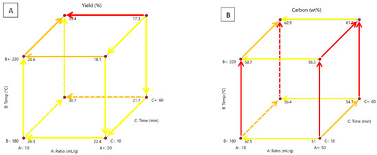 The arrows point in the direction of positive development in the property, showing how changes in a variable have an effect. The colours show the impact of the variable, with red showing the most difference between property values, orange showing an intermediate amount and yellow showing little difference. Yield is important because it determines the amount of product made and how much material is lost. If the yield is too low, producing the material may not be profitable. The method of solid separation will affect yield. It has been found in another study that Büchner filtration is more effective than folded filter paper [28]. In this study, vacuum filtration with a Büchner funnel was used. Design Expert deemed the solution ratio the most significant factor, the temperature the least significant and there are two-factor relationships, seen in the table in Table A5. According to Figure 4A, yield is highest with a low solution ratio, high temperature and high residence time. The yield is the lowest with a high solution ratio, temperature and time. This shows that the effect of temperature and time is insignificant. The solution ratio only has a significant effect at high temperatures and residence time. Time only has a significant effect at high temperatures and low solution ratios. At shorter residence times, the biomass may only degrade thermally and not fully convert. Longer times may enhance the polymerisation reaction of intermediaries, increasing yield. Another study found that processing time has little significance on the yield [11]. From the yield results and FTIR data, it can be assumed that an increased amount of solution enhances biomass hydrothermal decomposition. Higher solution ratios of water act as a solvent, increasing feedstock solubility and intermediate products, producing less char [46]. At 100 °C, water-soluble components are dissolved. At 150 °C, hydrolysis starts and carbonisation starts at 180–250 °C [14]. The main mass loss comes from the degradation of hemicellulose over a temperature of 180 °C [33]. Hemicellulose thermally decomposes at 180 °C and cellulose at 200 °C to form monomers and oligomers while lignin decomposes at 220 °C and remains mostly untouched [11,14,18,23]. Higher temperatures offer more heat for breaking bonds in the biomass during HTC [2]. Temperatures below 210 °C do not alter the properties of cellulose and lignin [37]. This means there will be a rapid reduction in yield as these three major components degrade at high temperatures. It is also known that high temperatures enhance hydrolysis, dehydration and decarboxylation reactions which lead to mass loss [2,11,28]. Hydrolysis is the rate-limiting step, which can be increased with higher temperatures, but this increases liquid and gas yields [37]. In another study, it was found that a longer residence time and a high temperature had the highest yield, similar to the current study [8]. In other studies, higher temperatures and times resulted in a reduced yield [2,6,11,12,14,17,18,23,28,33,38,46,47].