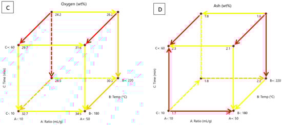 Cubic display of the effect of process temperature, solution ratio and residence time on (A) hydrochar yield, (B) carbon content, (C) oxygen content and (D) ash content, with highlighted relationships and direction of development.
