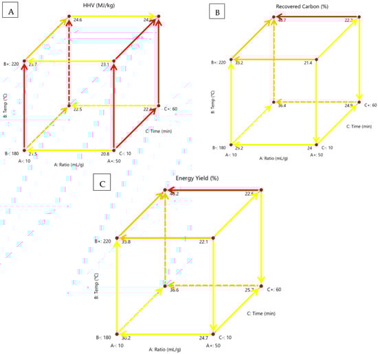 Cubic display of the effect of process temperature, solution ratio and residence time on (A) HHV, (B) recovered carbon, (C) and energy yield, with highlighted relationships and direction of development.