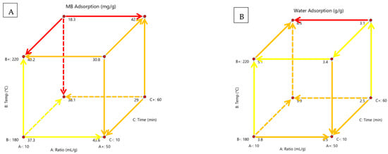Cubic display of the effect of process temperature, solution ratio and residence time on (A) MB adsorption and (B) water adsorption, with highlighted relationships and direction of development.