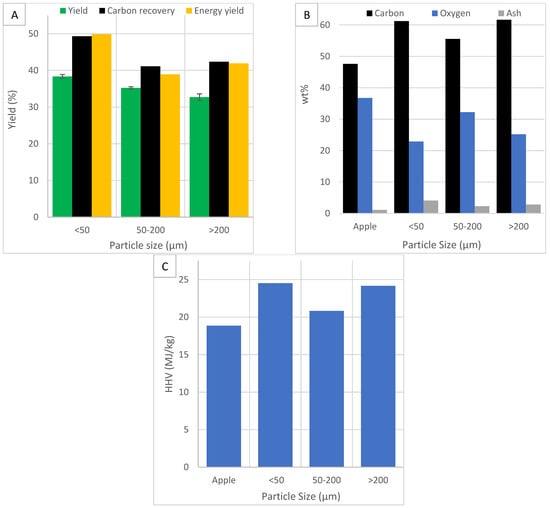 The effect of particle size on (A) HC yield, carbon recovery and energy yield, (B) carbon, oxygen and ash content and (C) HHV.