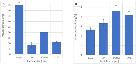 The effect of particle size on (A) MB adsorption and (B) water adsorption.