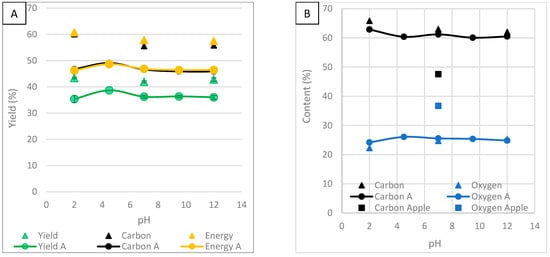 Figure 7A shows the effect of particle size on HC yield. The standard error bars for yield are small, indicating the results are consistent. Yield increases as the particle size decrease. The heat from different milling processes has been shown to denature proteins, reduce amino acids and reduce saturated fatty acids in wheat flour [50]. The size reduction process may affect the biomass in such a way as to affect yield and carbonisation. At smaller particle sizes, water can penetrate the pores easier and the greater surface area will enhance the rate of heat, mass transfer and reaction kinetics [38]. A particle size reduction can reduce cellulose’s crystallinity, which improves hydrolysis reactions [38]. This improves the disintegration and separation of lignocellulosic material, reducing yield. In another study, decreasing particle size caused a decrease in yield and energy yield but HHV remained relatively unchanged, suggesting a smaller particle size promotes HTC [51]. In another study, decreasing particle size caused a decrease in yield and energy yield and an increase in HHV [38]. In this study, a different trend is displayed. A possible reason could be the choice of feedstock. The combination of apple feedstock and increased reactivity from size reduction may favour the conversion to the solid char fraction over the liquid fraction. Another possible reason is larger particle sizes may be receptive to microwave volumetric heating, increasing thermal degradation and decreasing yield. More effective microwave heating has been shown to significantly affect carbonisation [26].