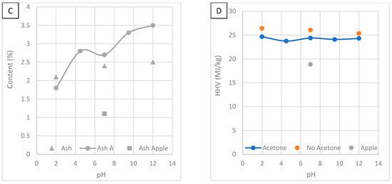 Figure 1B shows the effect of a solution with a low, neutral and high pH and acetone washing on the HC FTIR spectrum. They show a similar spectrum to the previous hydrochar. This suggests that changing the solution pH or washing with acetone did not modify the chemical structure of hydrochar. Acidic and neutral conditions show a higher intensity of C=C and C=O than basic conditions, suggesting basic conditions are detrimental to the HTC process and decarboxylation reactions. Neutral conditions showed the least reduction in C–O groups, with acid and basic showing the most reduction. This suggests acidic conditions were the best for enhancing HTC. Acetone washing was most significant in basic conditions. When HC is not washed with acetone, O–H and C–O show a higher intensity. However, not acetone washing also improved C=O and C=C intensity and aromaticity. The reduction in all peaks suggests that the acetone dissolved volatile components, refining the HC. In other studies, acetone washing reduced aromatic ester C–O, C=O and chain C–H groups suggesting the removal of fatty acids, decreased alkyl groups and increased aromatic groups [36,39,40]. It has been reported that washing with acetone causes the enhancement of aromatic structures and dissolves fatty acids [40].