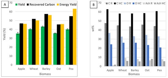 Figure 7B also shows the effect of particle size on ash content. Ash content increases after HTC. Ash content is greatest at the smallest particle size. The smallest particle size shows the highest yield and carbon content, suggesting most of the oxygen-rich components have been removed. This should leave a more porous structure than the other particle sizes, resulting in the re-adsorption of ash compounds dissolved in the process water [1].