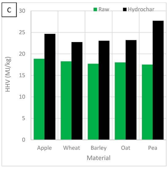 Biomass has different compositions of moisture, volatiles, hemicellulose, cellulose, lignin and ash. These compositions will affect the properties of HC. Recent studies have been performed on waste biomass such as corn stalk, biogas digestate, sewage sludge, watermelon peel, cotton stalk, rice straw, beet pulp and coffee grounds [2,10,16,19,20,23,28,29]. In this study the waste material from common agricultural products was used, wheat, oat, barley and pea straw and powdered apple. The production, area, yields and top two producers of the biomass feedstocks used in this study are displayed in a table in Table A1 [30]. Table A1 shows that the chosen biomass is produced in vast amounts worldwide and uses massive amounts of land. This makes them abundant and accessible feedstocks. In recent work, we used pea haulm as an effective biosorbent for dye in wastewater [31]. Therefore, the produced HC may show similar effectiveness. We have recently shown that carbonaceous material can be produced on an industrial scale from pea waste using microwave heating [32]. Wheat is the third most produced crop after maize and sugar cane [30]. For every tonne of wheat grain, one tonne of straw remains [33]. Oats and barley are primarily used for animal feed, but a large portion of the barley is used in the production of beer. Barley and wheat-derived HC has been investigated in other studies but not within the same context [9,33]. The chosen waste biomass feedstocks have not been investigated in this context previously and may offer new insights into their potential application.