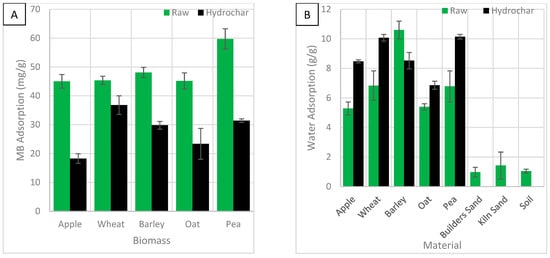 Figure 8B shows the effect of particle size on water adsorption. HTC improved water adsorption. This is likely because of increased porosity and surface area. Water adsorption is highest between 50 and 200 µm and lowest at small particle size. The results are similar to MB adsorption. The middle range had the least carbonisation. This meant more oxygenated groups, more hemicellulose and therefore increased hydrophilicity and wettability than the other HC. This increased water adsorption in the middle range.