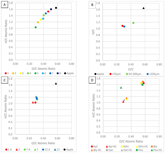 Figure 1D shows the effect of biomass feedstock on the HC FTIR spectrum. The biomass spectrums are nearly identical. The HC spectrums are similar to previous HC, suggesting feedstock does not modify the chemical structure of HC. All the biomass shows a similar reduction in O–H groups, except wheat. Barley and oat showed a reduction in C–H groups and therefore reduced aromaticity. Only apple showed an increase in C=C and C=O groups. All the biomass showed similar reductions in C–O groups.