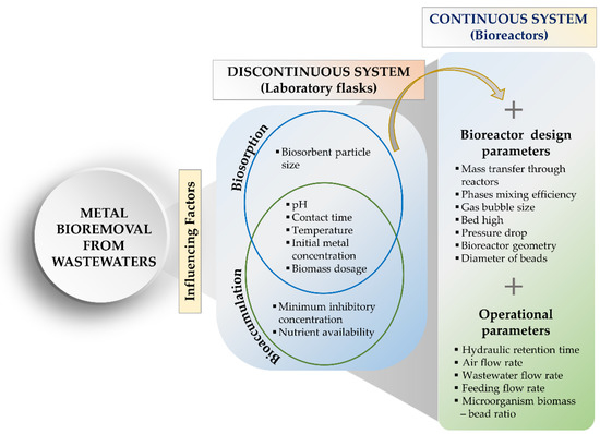 The metal removal from wastewaters using microorganisms is influenced in discontinuous, as well as in continuous, systems by various factors. The optimization of process parameters is of utmost importance for a successful bioremediation of pollutants [22]. Common parameters to both systems are pH, temperature, initial metal concentration, and biomass dosage [15,20]. Metal uptake performance in continuous systems also depends on factors associated with the configuration and the operation mode of the bioreactors (Figure 1) [15,21]. Mass transfer through reactors, phases mixing efficiency, gas bubble size, bed height, pressure drop, bioreactor geometry, diameter of beads, hydraulic retention time, air flow rate, wastewater flow rate, and feeding flow rate are among the most relevant factors related to the configuration and the operation mode of the bioreactor [23,24].