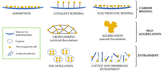 The immobilization of microorganisms can be achieved by several methods such as encapsulation, adsorption, aggregation, cross-linking, covalent bonding, and entrapment in a matrix (Figure 2) [26]. According to Emami Moghaddam et al. [41], the attachment and entrapment are the most-used immobilization techniques. The microorganism cells can be naturally immobilized due to their ability to attach to the surface of natural or synthetic materials and grow on them (passive immobilization), or by active-assisted immobilization using covalent bonding, cross-linking, encapsulation, and entrapment in a matrix. In natural attachment are involved both physical (electrostatic and hydrophobic interactions) and chemical (covalent bond formation) interactions between matrix and biomass cells, the electrostatic interactions being the most common involved in the initial stage of immobilization [41]. By adsorption, the microbial cells are attached on the surface of the matrix through electrostatic interactions and Van der Waals forces [42], while in covalent binding, the attachment is done by the formation of covalent bonds between the cells and matrix in the presence of a binding agent [41,42]. For the entrapment of the microbial cells, a three-dimensional sol-gel matrix is used (mostly silica-based materials) [43].