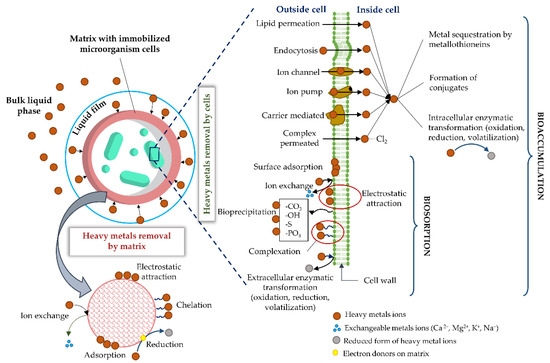 Mechanisms involved in heavy metals removal by a matrix with immobilized microbial cells.