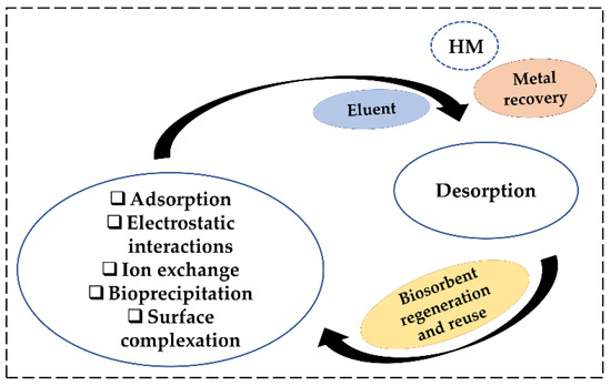 Sorption-desorption studies carried out in continuous systems are important for the future upscale of wastewaters bioremediation by microbial biomass. The desorption process consists of the application of an eluent (namely a base or acid), which facilitates the unbinding and recovery of the metal ions from the surface of the microbial biomass [95]. In the case of the bioaccumulation process though, the desorption cannot be performed for metal recovery. As in the case of the biosorption, the pH is the most important factor influencing the efficiency of the desorption process [96]. The sorption-desorption mechanism is illustrated in Figure 4.